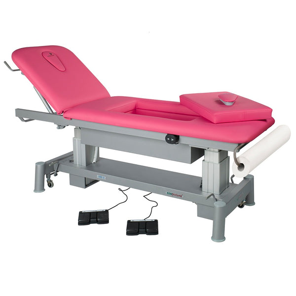 пневматична напомпваща се част, се надува с бутони от двете страни на кушетката и се оформя по корема на пациента. Размер на отвора: 36*63*26 см. възглавница, която затваря напомпващата се част, за да може кушетката да се използва, като стандартна 2 отвора за лицето, държач за руло, спускащи се колела за придвижване на кушетката интегриран USB порт |